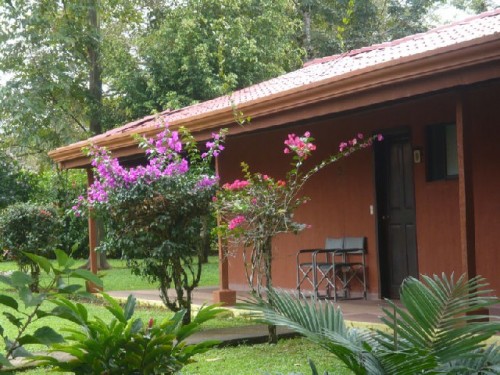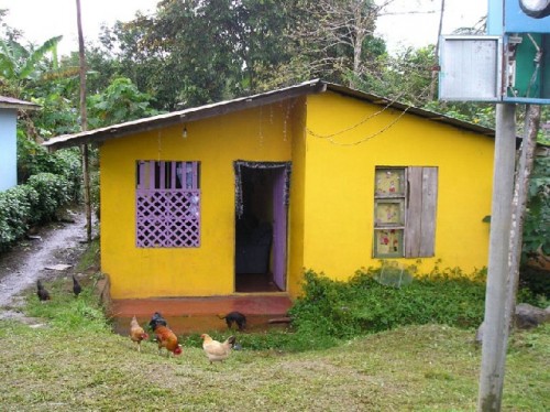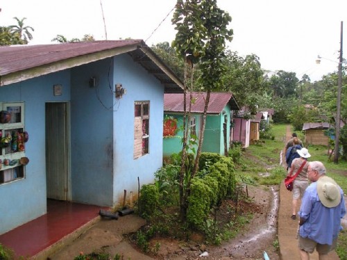 The next overland adventure was to Cano Negro Wildlife Refuge near the Nicaraguan border in the north. On the way to visit a village inhabited by the Maleku, one of eight indigenous communities left from Costa Rica's original twelve, we drove through heavy rain on a bumpy road filled with potholes and puddles, and crossed rickety bridges over streams. We arrived in a village of brightly-colored small houses: ochre with purple trim, green with pink columns and pink with matching tulle curtains. Laundry seemed to hang everywhere. In this poor but cheerful community lived a proud people, trying to preserve their culture against the influence of churches. A Methodist church was visible at the entrance to the village.