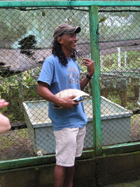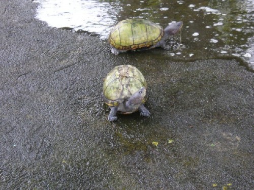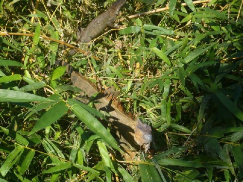 Later we visited the Turtle Conservation Center. Started in 1991, the project has been able to mark 48,000 turtles by cutting a notch in their shells. Seven families collect the eggs in swamps, and incubate them after cleaning and measuring them. By controlling the temperature of the nesting area, the families are able to determine the sex of the turtles: 33-35 Celsius for females, and cooler temperatures for males. Each female hatches 6-38 eggs, producing 18,000 freshwater green turtles per season. After three months 30% of the turtles are released to the wild, another 30% are split between the families and the conservation center, and the rest are sold to aquariums. 80% of the eggs in the center hatch, with a survival rate of 5%, as opposed to 40% of those hatched in the wild, with a survival rate of 1-4%. Ants, birds, raccoons, jaguars and humans seek the eggs for food. Female turtles stay fertile up to 70 years and have a life span of 140 years. A turtle's gender can be identified at seven months: males are small; females have a flat belly and claws.