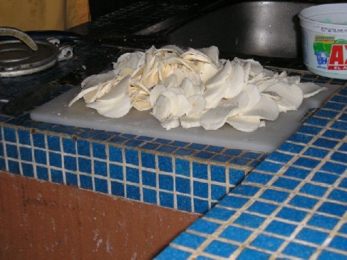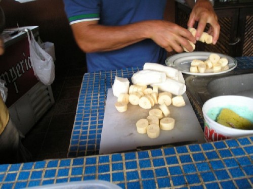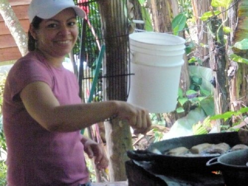 Our morning activity was a trip to Chachagua, a town of humble homes with satellite dishes. Here we visited Rosie, who taught us how to make empanadas. Round balls of dough are pressed out by hand into circular shapes and spread with cooked mashed beans and cheese. Then, they are folded into a half-moon shape and sealed by pressing the edges with the tines of a fork. After we had initialed our empanadas, Rosie deep-fried them in safflower oil. Accompanied by our choice of filtered coffee or sweet water, made by boiling sugar cane in water flavored by star fruit, we enjoyed the empanadas with commercially available Lizano Salsa.