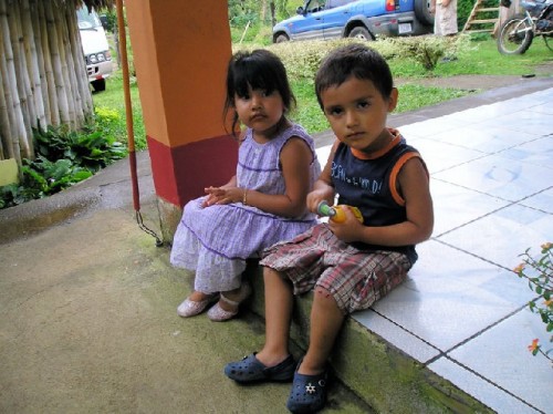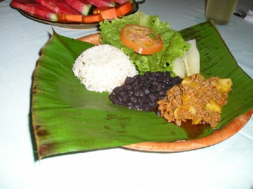Splitting into groups, we had a home-hosted lunch with families of the students. My group visited a farming family with four children, two of whom were at home. The father, who knew some English, explained that his crops were mainly plantains and cassava; he supplied the wholesale market. Our meal consisted of palmito (palm heart) salad, fried plantains, and beef with rice and beans, served with tortillas and rice pudding.