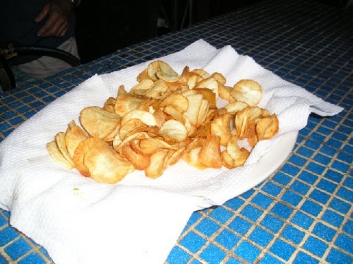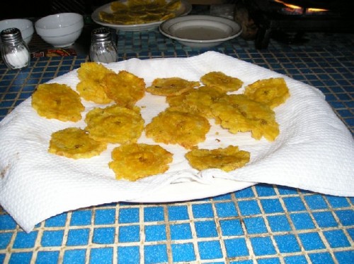 Our day ended at the lodge bar making tapas: thinly sliced and deep-fried juca chips, pressed and fried thick slices of plantains as canapés for refried beans and guacamole, plus a delicious relish made of onions, tomatoes, cilantro, lime juice, soda water and pepper sauce. We helped slice and chop the vegetables, and enjoyed the tapas with a drink afterwards.