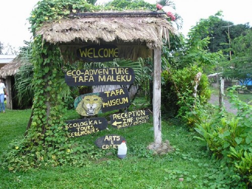 After viewing crafts, we enjoyed lunch in the communal space. Lunch was typical meat casado with juca, served on a banana leaf. Water was potable, even in this remote area. While the government has not yet invested in back roads, it provides electricity and pipes water from filtering stations to every community. Walking through the village with Iqui, I saw a sign saying "Here we strive to be better." A soccer field stood idle due to recent rain. We stopped by the radio station and met the Maleku DJ. Working solo, he broadcast daily from 4 am to 6 pm. With deep appreciation for these hard-working, beautiful people, we continued on our way.