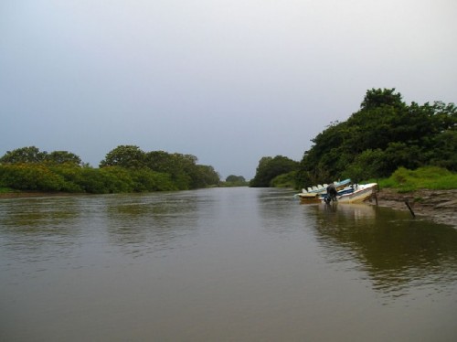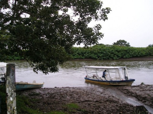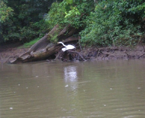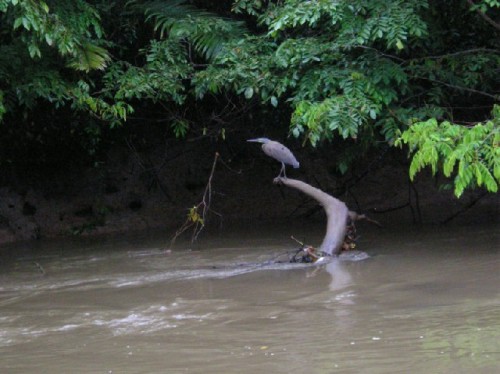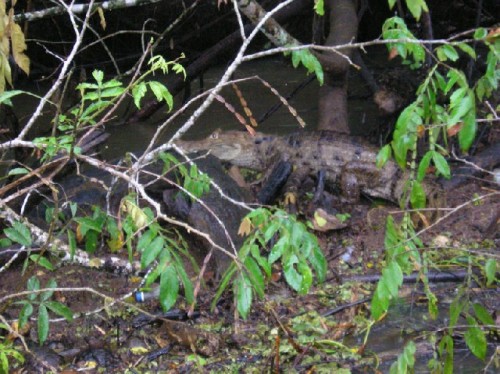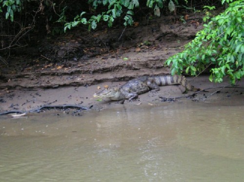 At 6 am we left for a boat ride through the inland canals in search of wildlife. We glided between banks lined with palms and jungle growth stretching out over the water for sunlight. Families of caiman sunned themselves on the banks, blending in with the logs. A flock of vultures took off from a tree; snowy egrets, still as statues, perched on branches. A tiger heron with striped feathers and a green kingfisher looked for food while our boat maneuvered amid intermittent rain. A haven of biodiversity, cormorants, tanagers, northern jacana, jabirus and wood storks, whistling ducks, iguanas, and many other species enjoy the jungle along these inland waterways.