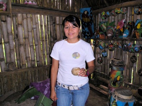 Iqui, our Maleku hostess, spoke of her people's beliefs and way of life. The Maleku generally do not marry outsiders; in the rare event of such a marriage occurring, the new spouse must be accepted as a member of the community. The Maleku believe in nature and communicate with their god individually, by a river or mountain. They bury their dead in their homes, stacked up in the kitchen, as they have limited land. Maleku women who are divorced or widowed may not marry again. The colors on crafts, such as gourds and masks, are inspired by vegetation. The Maleku use iguana skin for drums and eat Iguana meat, which tastes like chicken.