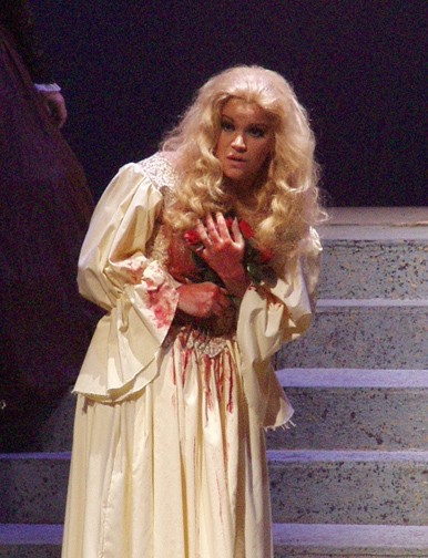 Lucia was fearlessly sung by Olga Orlovskaya, a young Russian soprano. A glamorous redhead, she suggested Lucia’s emotional fragility from her first appearance. Orlovskaya excelled at coloratura, although her voice was a little constricted toward its top. She totally nailed the mad scene, however, negotiating the perilous changes in tempo and dynamics and hitting all the high notes without apparent effort. Her performance was heartbreaking. (Although she should reconsider her windmill-like arm waving to suggest derangement.)