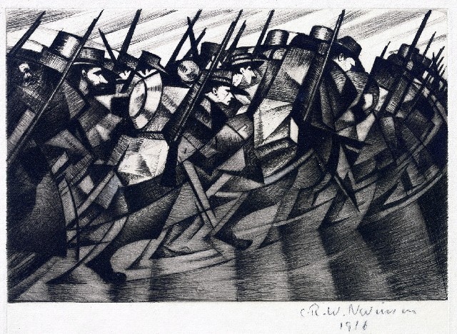 Another portion of the exhibition features two notable British printmakers, Edward Wadsworth and C.R.W. Nevinson, whose imagery focuses on the actions and aftermath of World War I. Both engaged in Britain’s military efforts during the Great War. Wadsworth initially interpreted photographs taken by reconnaissance floatplanes of the Royal Naval Air Service and later served as a port officer in Liverpool, where he oversaw the painting of camouflage designs on British ships. For a short time Nevinson was an ambulance driver and later contributed to a series of government-sponsored propaganda lithographs. Each in his own way visually chronicled the war’s impact on human lives and the landscape that surrounded them.
