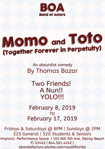 Performances of Momo & Toto (Together Forever in Perpetuity) are at 8 p.m. Friday and Saturday, Feb. 8 and 9, 2 p.m. Sunday, Feb. 10, as well as 8 p.m. Feb. 15 and 16, as well as 2 p.m. Feb. 17. The production will run at Improv U., 105 NW 5th Ave. in Delray Beach. Tickets are $20 for students and seniors and $25 general admission. For more information, visit https://abandofactors.wixsite.com/southflorida