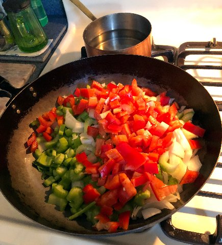 From watching chef shows I am getting better at slicing onions, in this case four, medium, sweet ones, but my “knife skills” are less than spectacular.