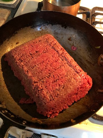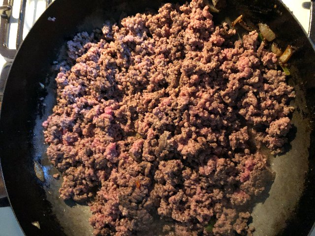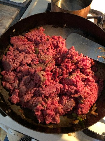 Separately I browned three pounds of lean ground meat. That was chopped up until it lost its red color.