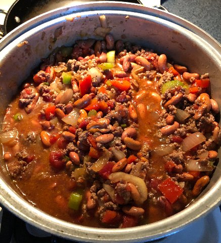 The mixture was brought to a boil then on low heat simmered for two and a half hours. I stirred the pot at regular intervals and filled a cup for lunch. I did not precook the beans so they kept their texture. This is an advantage, and cheaper than using canned beans.