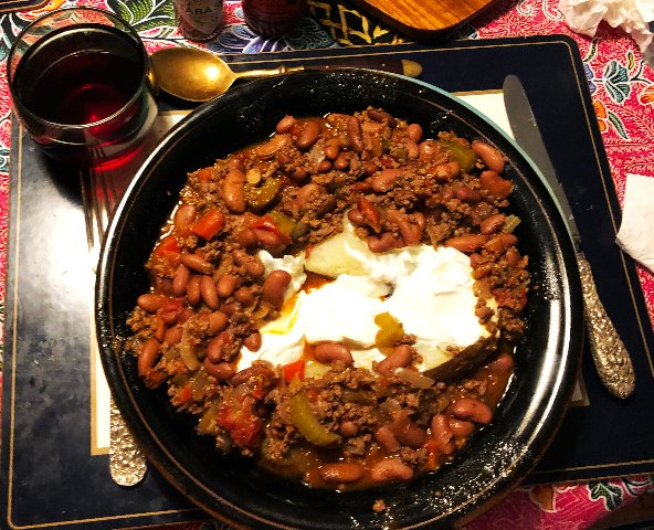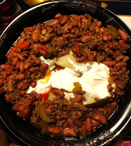 The potatoes were baked for two hours and proved to be just perfect. One was placed in the center of the bowl, split, and filled with sour cream. The chili was ladled around it.