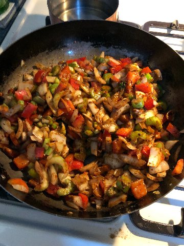 It was a large amount so I caramelized in a wok. To which I added a mélange of spices. Three teaspoons of cumin, two of spiced paprika, and two of chili powder.