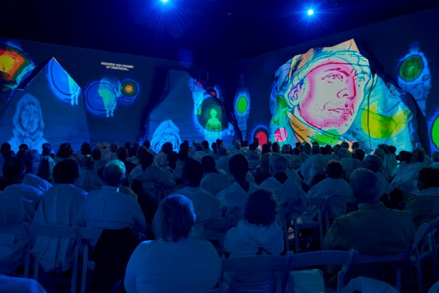Rather than a traditional live performance, the soundtrack for this production is recorded. The box-like, flat-floor theater provides scenic-surround, with motion-capture animation projections on all four walls. Having the grainy, low-resolution, slow-moving look of images from a graphic novel, its illustrations are by Mark Simmons, projection design by David Murakami, and scenic design by Jacquelyn Scott. Most of the important visuals project onto the forward sections of the venue’s wall, but scouring the full 360 degrees is certainly grounds for neck ache.