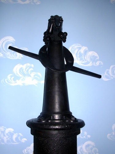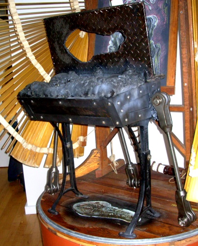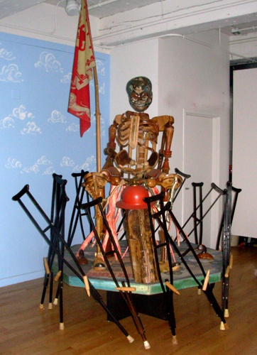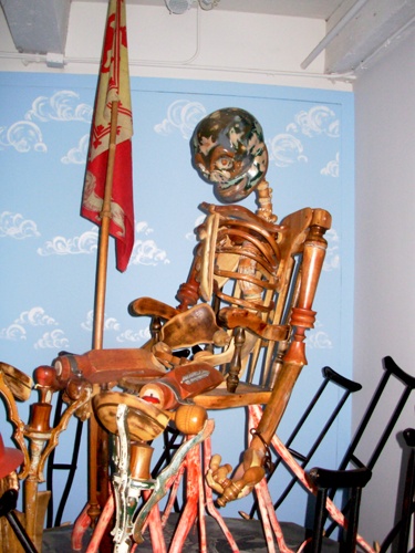 I asked how he managed to find the time for his own work and whether the intense involvement in helping other artists to realize their projects sapped into his creative juices? He described working at Mass MoCA as the day gig and what goes with the territory as a "Bread Winner." That in a relationship between two artists with two kids one partner has to be relied upon to bring home the bacon. But he leaves the job behind on weekends, and during down time between Mass MoCA projects and its related travel, to do his own work. In the house/ studio in Vermont he also has the space to collect the odd materials that eventually find their way into the sculptures. We wondered if he drove around on Trash Night and scavenged recycled materials. But he regretted that you don't have that opportunity in the country unlike discarded treasures piled on the sidewalks of New York or London.