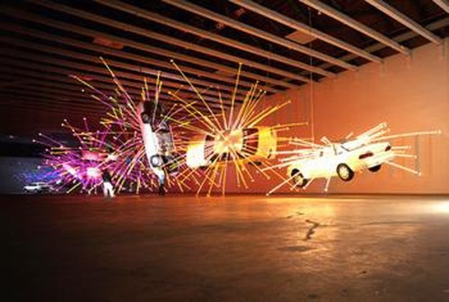 Forming a question I described a perception that many artists working with installations or art/ science and technology often don't know what they are doing. They may have a general idea but are then dependent on individuals like Criddle to execute their visions. He disputed that notion. "Most artists we deal with have a very clear idea of the end goal. We do our level best to host, foster and incubate that process. For example, when Cai Guo Qiang worked with us I was presented with drawings and sketches of what he wanted for the large gallery in Building Five. It so happened that early on we made a model for the space on a scale of a half inch to the foot. The actual model is 16' long. I went on the internet and purchased a bunch of model cars that were also on the scale of a half inch to the foot. Using the kind of flexible aluminum wire which sculptors use to form armatures I was able to draw three dimensionally and place nine Ford Taurus cars in the space using the model. When Cai came back to Mass MoCA he was able to manipulate the model cars and get them precisely how he wanted them."
