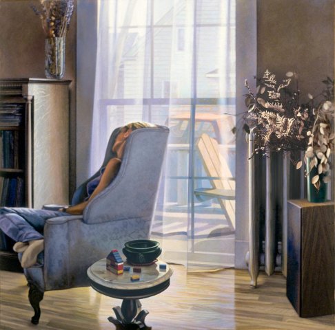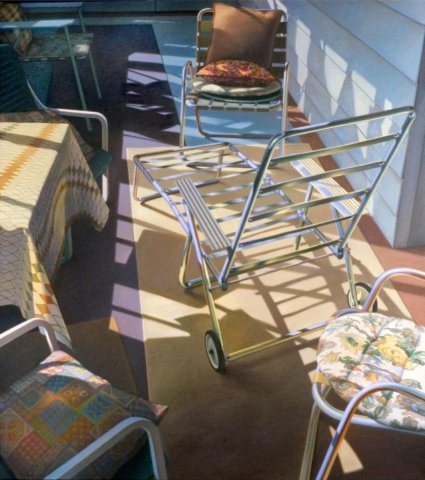A sustaining through line of the meticulously rendered paintings has been a mastery of color. The theme of a garage and yard sale was depicted with a specific time of day, lighting and palette. This evoked layers of perception and observation to what initially seemed quite straight-forward.