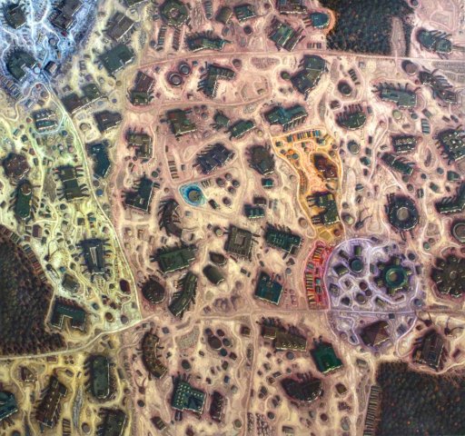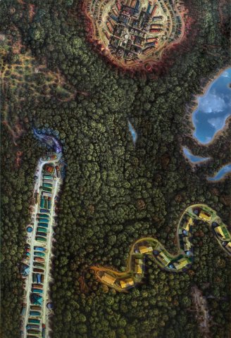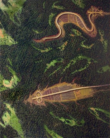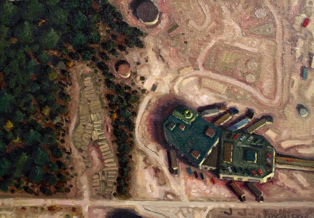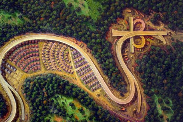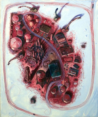 It seems to be required, or at least advantageous, for artists to cite the influences of old or modern masters on their work, no matter how negligeable that connection might actually be. At present, when there are no prevailing criteria to determine the quality of a work of art, claiming artistic lineage has become very important. I can make no claim of links to other artists in the form, color and brushwork of my paintings; my influences are mainly in spirit, by artists such as those mentioned above: Artists who took the risk of a head-on imaging of human conflicts and depredations, pulling no punches, loud and clear; art not intended for the living room (or the corporate boardroom). Beside those already mentioned, artists whose work I find compelling in this regard are Edward Burtynsky (large format photographs) and Alexis Rockman (paintings of man’s subversion of the natural world). Other than this, my biggest influence comes from those “big picture”, view-from-above images made by aerial photographers whose focus is the relationship of humanity to the planet, whether their goal is art, design or simply documentation.
