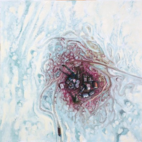 Nevertheless, that dealer’s comment did give me something to consider. Except for one thing: While, to my mind, I’m being perfectly clear and to-the-point in what I want to convey, the viewers’ responses are sometimes exactly the opposite of what I intended: A painting of the Union Carbide plant in Connecticut, seen from above, with a “head” and “tail” and claw-like appendages for parking, made to appear as if slithering though a dense woodland, appeared to a scientist (who bought the piece) as “man and nature working in harmony”. Another time, a forest penetrated from 3 sides by a snakelike tract house development, a viral-looking industrial park, a parking lot, and a tractor trailer depot, looked like Progress and "capitalism at its best" to a viewer, in spite of the fact that the work was titled "Invasive Species". What I’ve come to realize is that the paintings act as a litmus test of where the viewer’s sympathies lie: An oil drilling camp despoiling a pristine icy terrain might be horrifying to an environmentalist but thrilling to an oil company executive; A tract house development of thousands of new homes, in overall shape reptilian and menacing, may trigger salivation in a real estate agent. So much for “hitting them over the head”.
