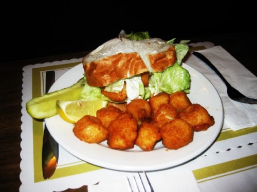 The plate was overflowing with perfectly done, succulent, nice size scallops. A golden brown and seemingly deep fried in fresh oil. There were more tucked into the sandwich between layers of lettuce and a generous slather of tartar sauce. There was a spear of pickle and a slice of lemon. Every morsel was just divine.