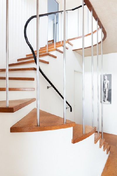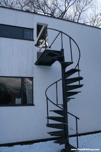 White clapboards, a traditional New England material, are used in a non-traditional way to great effect. Brought inside and applied vertically, Gropius' wife Ise felt that "their narrow vertical shadows relieve the white blandness and make an excellent background for artwork." The central stairs, again a New England tradition, was also modified by Gropius. The unusually curved staircase faces away from the entry, and thus implying the upstairs as private space.