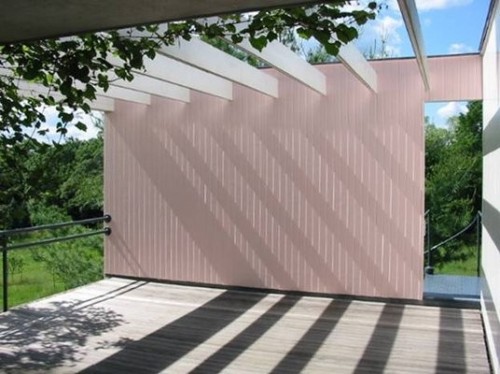 On the exterior are a few distinctive features as well. There is a wrought iron stairs that allowed his daughter to enter the house with her friends without going through the downstairs. There is also a roof deck adjacent to her room that allows for great views of the surrounding countryside. A wall there is painted a wonderful shade of pink to add a more subtle color to the rather colorless deck.