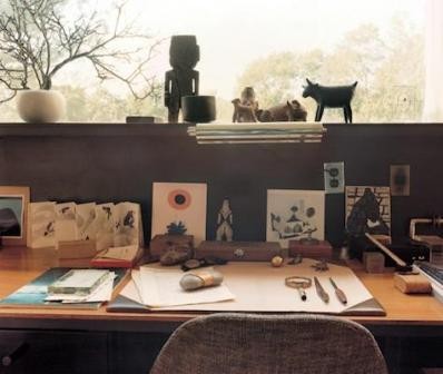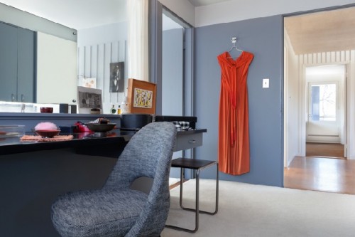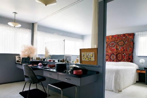 So this design allowed them to sleep in a cold environment but dress in a warmer one. There is also a curtain that could be closed for privacy. The door closed to keep out noise. Not afraid to make her own dsign statement, Mrs. Gropius would always leave a bright colored dress hung on the door, usually a red one, to add a color focal point to the room.