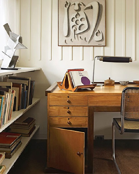 Also, there are two rather wonderful Bauhaus table lamps by Wilhelm Wagenfeld on each night table. In the dressing room, storage is built in behind doors making the use of any type of bureaus unnecessary. Artwork in the master bedroom includes an abstract piece by Gropius' good friend and colleague Josef Albers, and a drawing titled, "Underground Shelter with Figures" by Henry Moore, given to Gropius by the artist in 1941.
