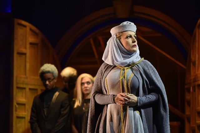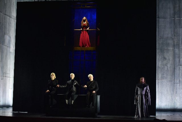 The set creates a drama. In earlier productions, it was conceived as the two-story, four-room vertical box in which multiple actions are taking place. We are now by and large in focus on one action after another, under the shadow of the tall grey walls. This intensifies the mystery and enhances the other-worldly quality of the opera.