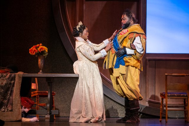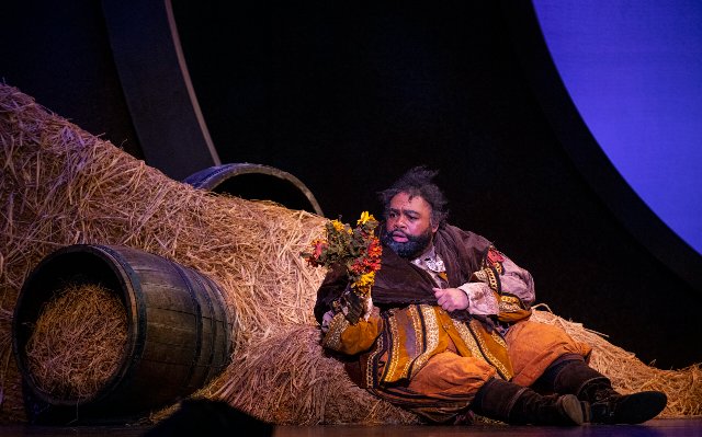 Opera San José’s casting is superb. Of course, the sine qua non for success with this opera is a compelling title character, and Darren Lekeith Drone transcends requirements in every way. His full baritone voice with warm vibrato suits the role well. Moreover, he nails the portrayal with a full range of visual and vocal expression. In his flouncy corpulence, Drone commands the stage, displaying pompousness and narcissism with everything from mugging to mock and genuine ire. His exuberance and smiling visage make him sympathetic enough to ultimately allow forgiveness in the end for his bad behavior.