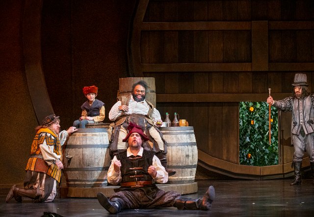 Joseph Marcheso conducts the orchestra with complete authority. The sound is always rich and bright and the pace is brisk. Marcheso navigates the dynamics and staccato elements with particular skill. Director José Maria Condemi deserves special commendation for orchestrating the onstage chaos, with striking movement and positioning. The laundry scene, in which the women have Falstaff hide in a clothes basket only to get dumped into the river is particularly raucous. Steven C. Kemp’s scenic design also deserves a nod. He uses a single and appropriate basic set in a reddish wood color that is built around the visual theme of wine kegs and openings framed by the head hoops of barrels. Additionally, kudos to Howard Tsvi Kaplan for costumes, Christina Martin for wigs and makeup, and David Lee Cuthbert for lighting.