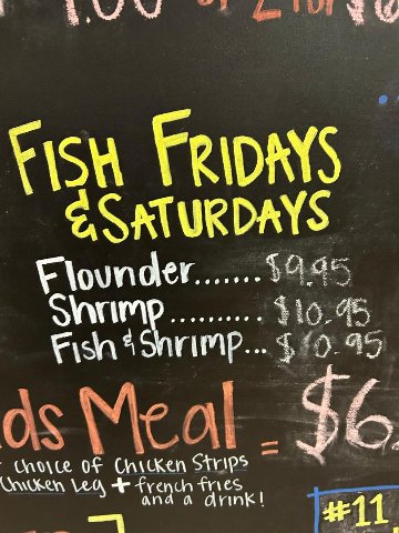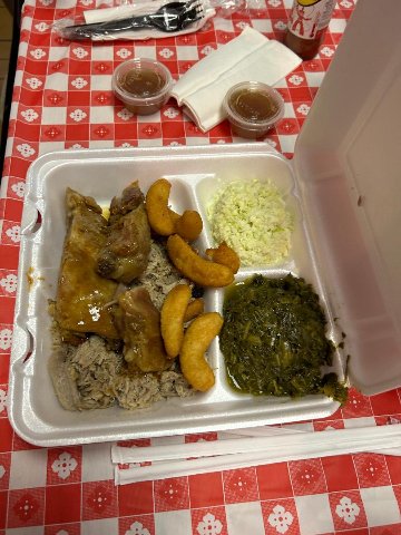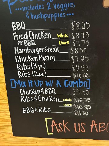 Fish Fry is featured on Friday. Praise the Lord. Fried chicken was an enticing option but we both went for barbecue with three ribs. Sides were collards and slaw for me. The hush puppies were tough and inedible.