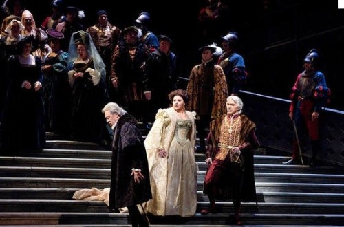 Apparently in support of the young singer Angela Meade, who someone has persuaded the General Manager will be one of the opera’s greatest ever singers if she continues on course, three wonderful stars were brought in to surround and in fact court Meade in the quadrangle that is Ernani. The singing is so superb in this production that you forget how improbable the plot is. Meade, who needs to be dressed to look her best, and have gowns as beautiful as her face, is well-served by the Met costume department in this Verdi role. She moves well, up and down the stairs, and nothing detracts from her stunning vocalizations. While some have complained that she is too advanced in her career to be an appropriate winner of the Beverly Sills Award, it was probably given to encourage Meade to continue on her already magnificent trajectory.