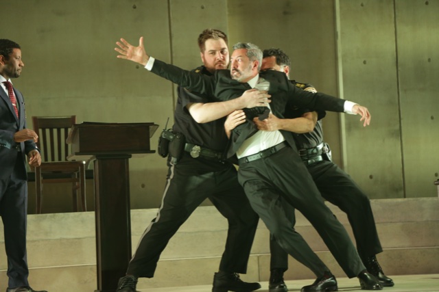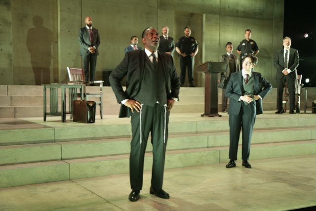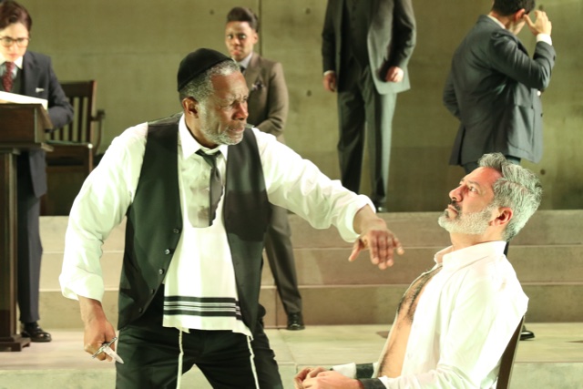 The production at the Polonsky Shakespeare Center is stripped down, yet magnificent. A central grand wall has two doors. It sits atop steps where much of the work plays out. Only Shylock enters through the audience, as if to take us to his point of view, to look with him at the white men on the stage.