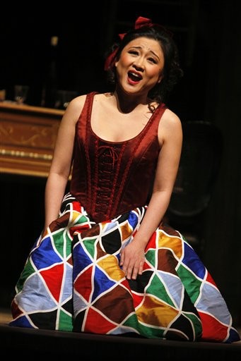 Zerbinetta's coquettish coloratura aria, in which Strauss refers to Donizetti and Bellini, is one of the most challenging in the literature. Kathleen Kim was charming in the role. She's a tiny woman who the commedia d'arte characters were able to lift and swing during the proceedings. The hoisting might have been foregone in favor of a soprano with more heft. Having just heard Diana Damrau sing the aria with the Met Orchestra under James Levine, it seemed unfortunate that Damrau has been re-deployed to Barber of Seville and La Fille du Regiment. Mine was an opinion of one as neighbors found Kim absolutely delightful.