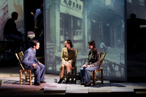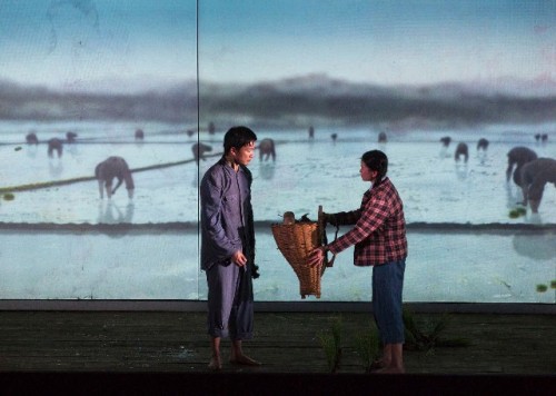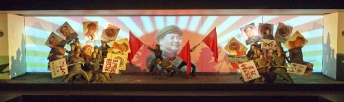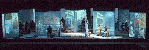 However, the stage sets were spectacular environments. The incredibly evocative video behind the rice paddies was visually poetic. Panoramic also was the Red Guard trial of husband and wife with flags and video of Mao's head surrounded by rays of red sun stretched across the stage. The fractured video screens evoked the alleyways and narrow streets of the city. Here, the depth of the stage was used to convey urban images of congestion, vitality and noise of modernizing post-Mao China.