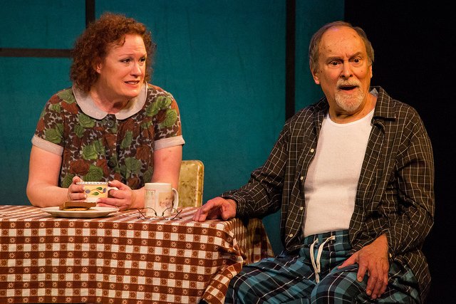 Eddie and Edna by Donald Loftus, directed by Matthew Penn. Here a big ticket issue was conveyed in a brief but poignant and spectacular manner. Again, in a very different manner, Wilson and Zukerman are paired. She is serving breakfast to her husband in an end phase of Alzheimer’s. There are tropes of illusion and reality then their son played by Michael Fell arrives. Quite succinctly in a masterful manner we are uncertain of what we have seen.