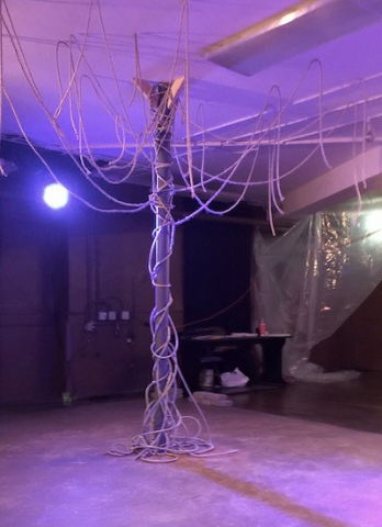 Eleanor Kahn’s set design is a barren stretch of desert or plain, with a few cement blocks strategically placed. The tree is a structural pole, strung with ropes representing branches. Lighting design by Claire Sangster skillfully adjusts the lighting as day moves toward evening.
