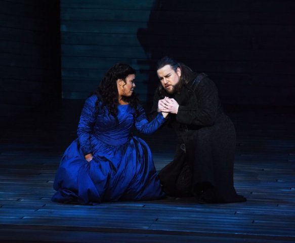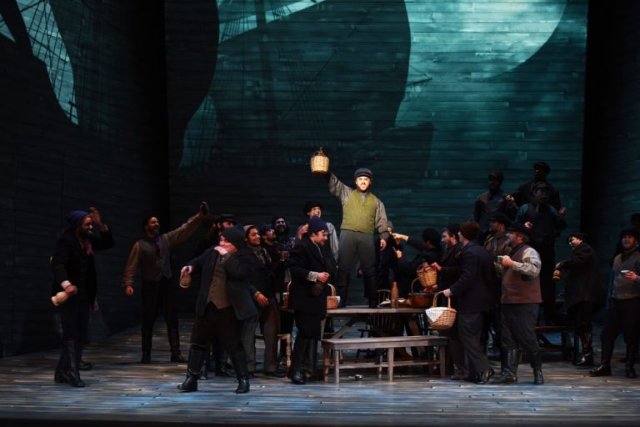 Act 1 is a dark affair, in terms of visuals and lighting. The tessitura is also very low with all male principal and chorus voices, dominated by two baritones. Noel Bouley is the Dutchman. His expressive voice captures the mournful and haunting tone of the forlorn sailor, while his acting conveys the gravitas of his tragic situation. Gustav Andreassen is Daland. He bellows and mugs as the captain, whose interest in financial gain is clear in the duet “Wie? Hört’ ich recht?” (Did I hear correctly?).”