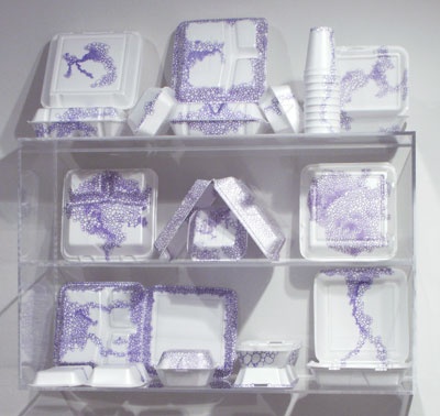 The stacks of Styrofoam trays, perfectly clean and unused, have been augmented with ballpoint pen loops. These cellular forms grow and spread across the plastic surfaces. Are they bacterial infections, made visible? Are they the decay matrix of the Styrofoam, perhaps a new environmentally-conscious version meant to disappear some centuries after use?