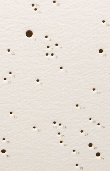 The work that seems most free from commercial concerns is defined by an obsessive need to count. "Constellation" consists of a random, vaguely spiral pattern of perfectly circular holes cut into a large sheet of paper. Each of these pin pricks is numbered in pencil. The process is evident: each puncture was first made and then recorded by the artist. The count starts at the center at "1" but out on the edges of this inverted star field I stopped trying to find anything higher than "11,441" or so. I wasn't willing to duplicate the artist's effort and perfectly enact the process the work required. But, then, I bet my kitchen isn't as clean as her's.