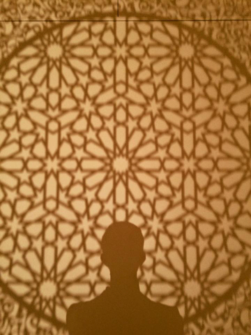 The center piece and “projector” is a hollow, laser-cut cube-shaped lantern. The structure is a visual reference to the Alhambra Palace in Granada, Spain, as well as to major mosques throughout the Islamic world and to the Moslem holy of holies, the Ka’ba in Mecca. It is simultaneously palatial and monolithic. Though hung from the ceiling, the square structure seems to levitate off of the floor. Its patterns and designs conjure up the contextual history of Islamic patterning and design. Its style and ornamentation feels universal: it combines the appeal of Eastern as well as Western style and ornamentation.