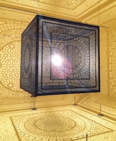 Looking at the sides of the installation’s sculptured feature, the four-sided box structure, it is clear that the artist has adopted forms from the Alhambra that, at one point in the past, represented the pinnacle of Islamic design. The major motifs create a visually striking unity that accentuates and connects the relationships among shapes and forms. Symmetry is primary. This type of assembly is filled with designs that generate more designs, so the surfaces are continually enriched by new shapes.