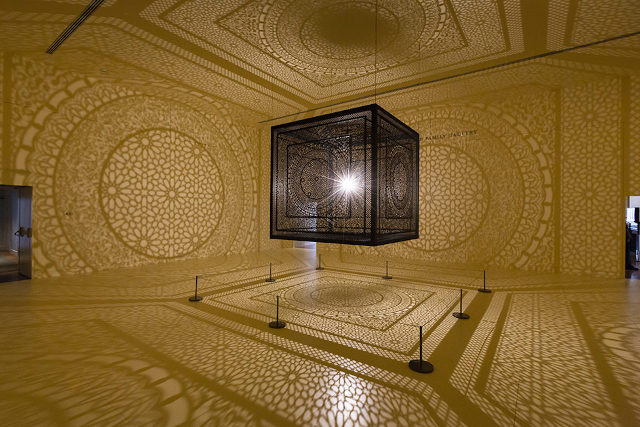 Intersections is immersive art. Its stunning geometry, inspired by traditional Islamic architectural motifs, explores how light and shadow can be arranged to visually and environmentally engulf the viewer.