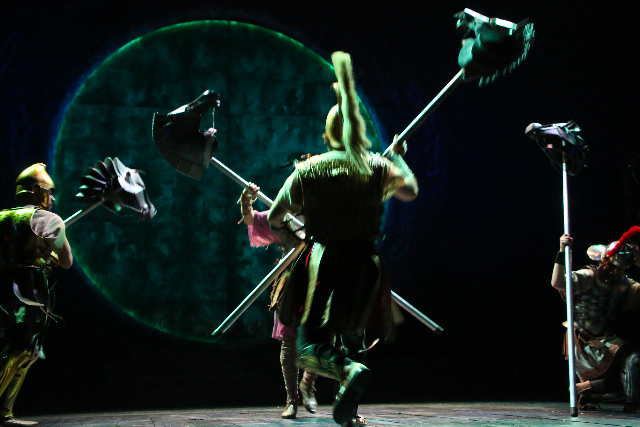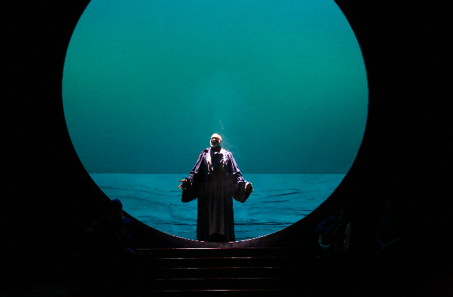 The storyteller Gower, whose history of Pericles apparently sat at Shakespeare’s side as he wrote, is a mammoth figure in this production. He not only stands in a gargantuan orb which circles the sea during the journey of the hero, but comes stage front to urge the story on. Raphael Nash Thompson takes the world in his large embrace, which also often reaches to heaven.