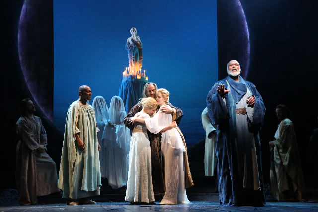 Trevor Nunn has created a terrific, unified production of a difficult play and offers moving scenes along with the rollicking good humor of characters who resemble the Three Stooges. We eagerly follow Christian Camargo as the Prince who would be good, relishing his detours on the dark side as much as his final ascent in the Temple of Diana.