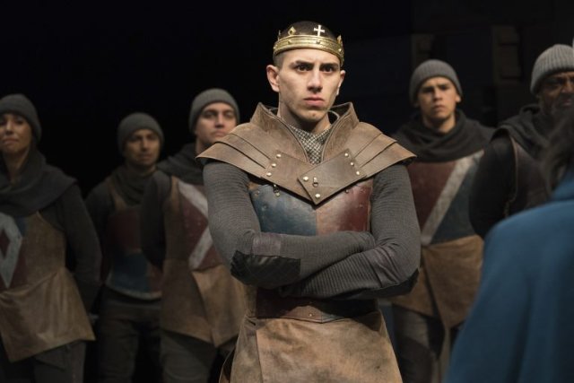 In keeping with Shakespearian tradition, minimalism drives the set in Henry V, but the overall staging is stunning. At the rear of the thrust stage, a single rampart stands, composed of gray, Lego-like boxes the sizes of orange crates and coffins. Those same decorations act as moveables to define everything from tables to walkways. The explosive sound and low but aptly manipulated illumination contribute to an unsettling ambiance befitting the circumstances. Notably, battle scenes are deployed without replicas of weapons. Instead, bright red shirts are used both to represent swords and blood, and the choreography of their contrast with the gray and sepia surroundings visually astounds.