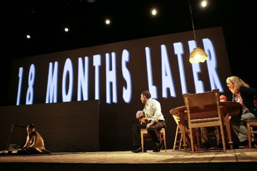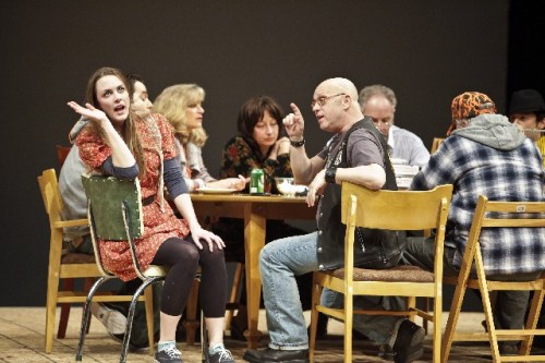 The play actually begins with various characters entering the stage and taking a seat around a large dinner table. Characters continue to be onstage even when they are not in a scene. Is this a play as radio program? Or, is it an effort to suggest the chaos of society? Direction and staging seem to have obscured the narrative.
