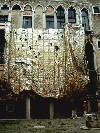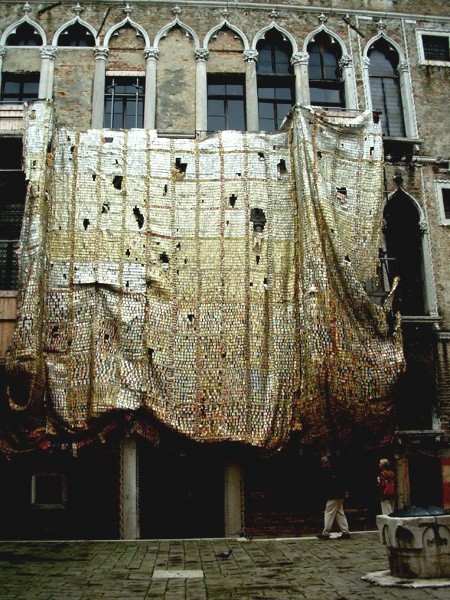 Our first impression of the Palazzo was an enormous, intricately patterned hanging by the African artist El Anatsui. While a new work it seemed to meld seamlessly into the ancient Venetian ambiance. It clung to the façade with rippling, irregular textures becoming a growth and veneer of the Italian Gothic architecture. Arguably, the artist's work will never find a more perfect setting.