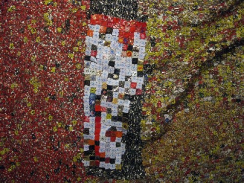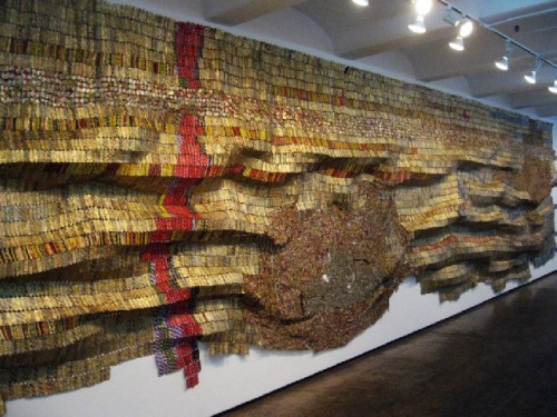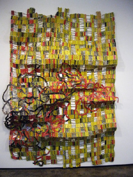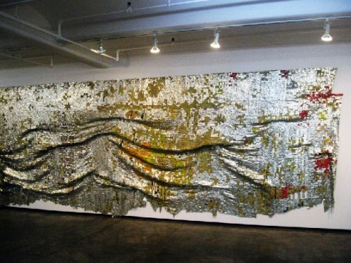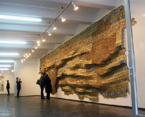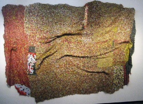 More of his work was displayed in the not entirely successful Biennale curated by Robert Storr. In this context the magic carpets of El Anatsui were knockouts . They are fabricated by the patient and meticulous assembly of tesserae from discarded pop cans and the foil that wraps the tops of fancy bottles. The work has the added insight of being created with recycled materials in an inventive and passionate manner. He emerged from the 2007 Biennale as one of the great stars of that ill fated project. The work was stunning in such a morass of general mediocrity and shop worn art stars. One did not have to travel to Venice just to see the New York friends of the curator.