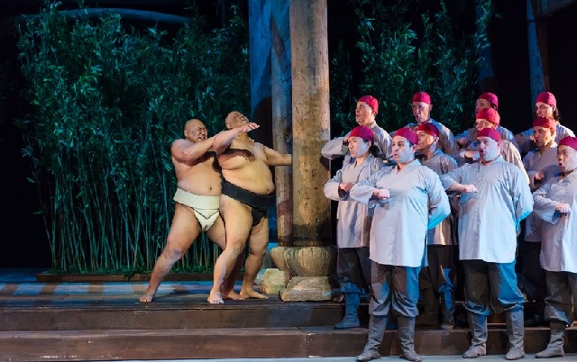 The temple first serves as the home of Cadmus, sung by Kyle Ketelsen in vigorous yet lyrical tones. Semele floats away like the horn-rimmed moon goddess of Chinese myth. The bamboo reeds waver in the wind, and through them a chorus of male and female monks emerge. They lapse into a sexual orgy at Jupiter's home, to accompany and mirror the activities of Jupiter and Semele.